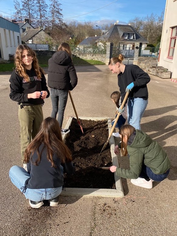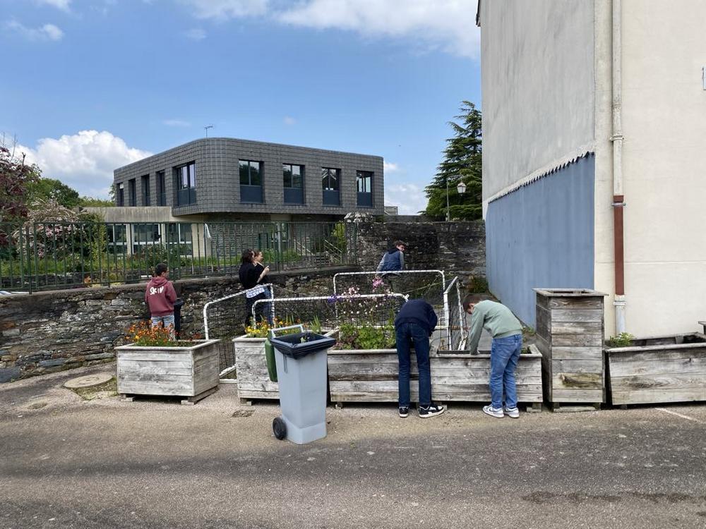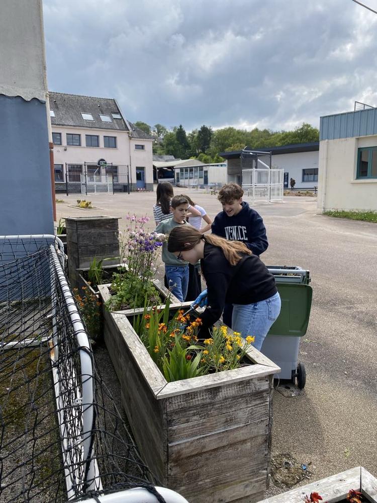 Les élèves de l'atelier "consommation et citoyenneté" ont participé au désherbage et à l’embellissement de la cour en semant des fleurs au Printemps.