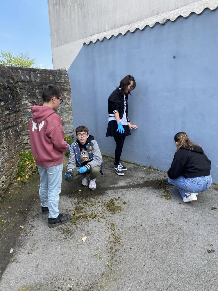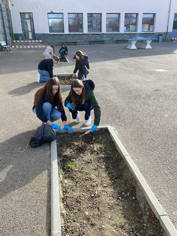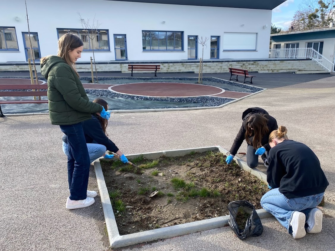 Les élèves de l'atelier "consommation et citoyenneté" participent au désherbage de la cours avant les plantations de Printemps.
