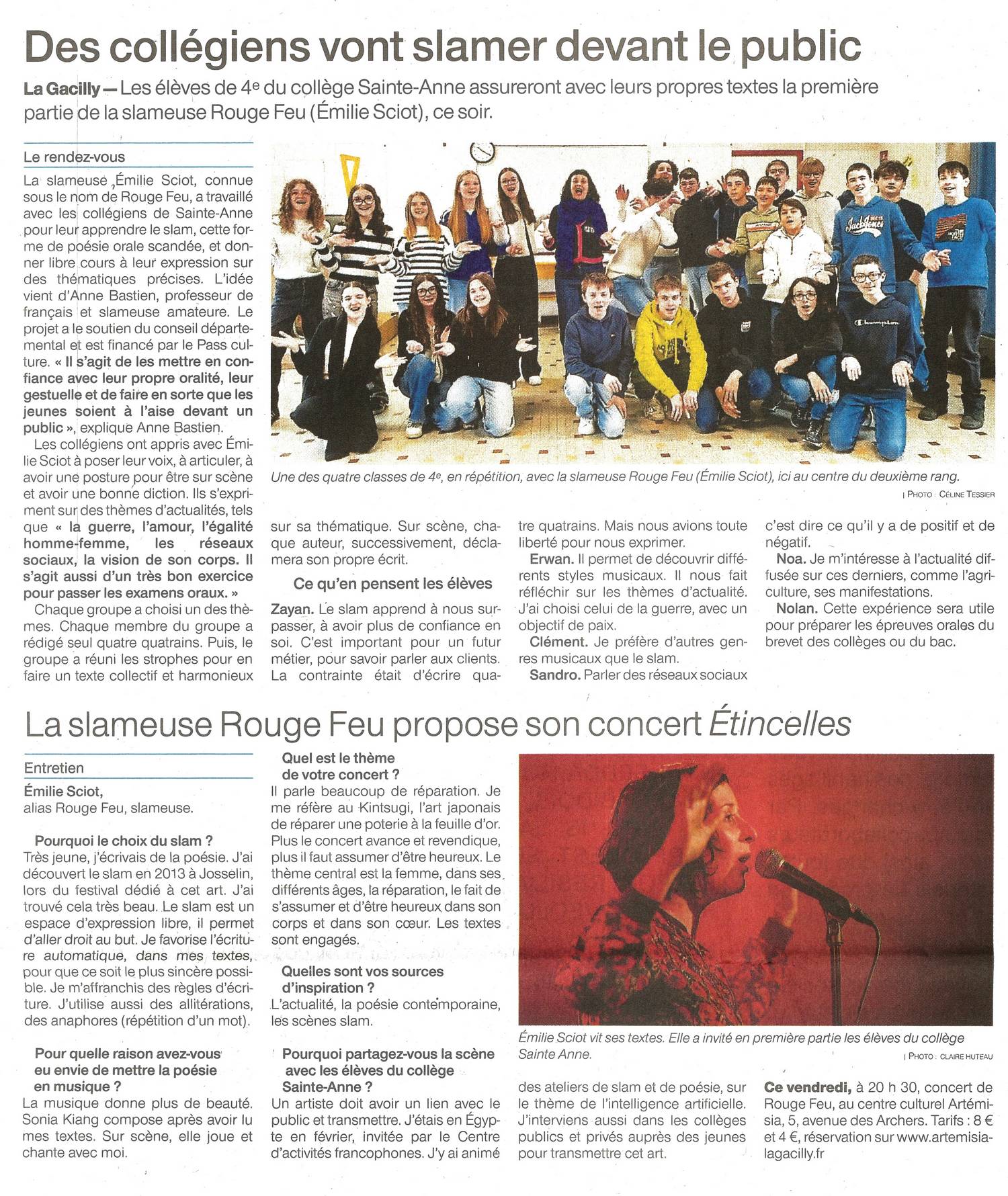 Encadrés par Emilie Sciot, slameuse professionnelle et quelques enseignants, l'expérience vécue restera gravée dans leurs souvenirs, teintée d'émotions et de rires. Le travail sur l'oralité gagne toute sa place au sein du collège et dans un monde où la parole libère les esprits et apaise les adolescents dans ce monde en mouvance.
