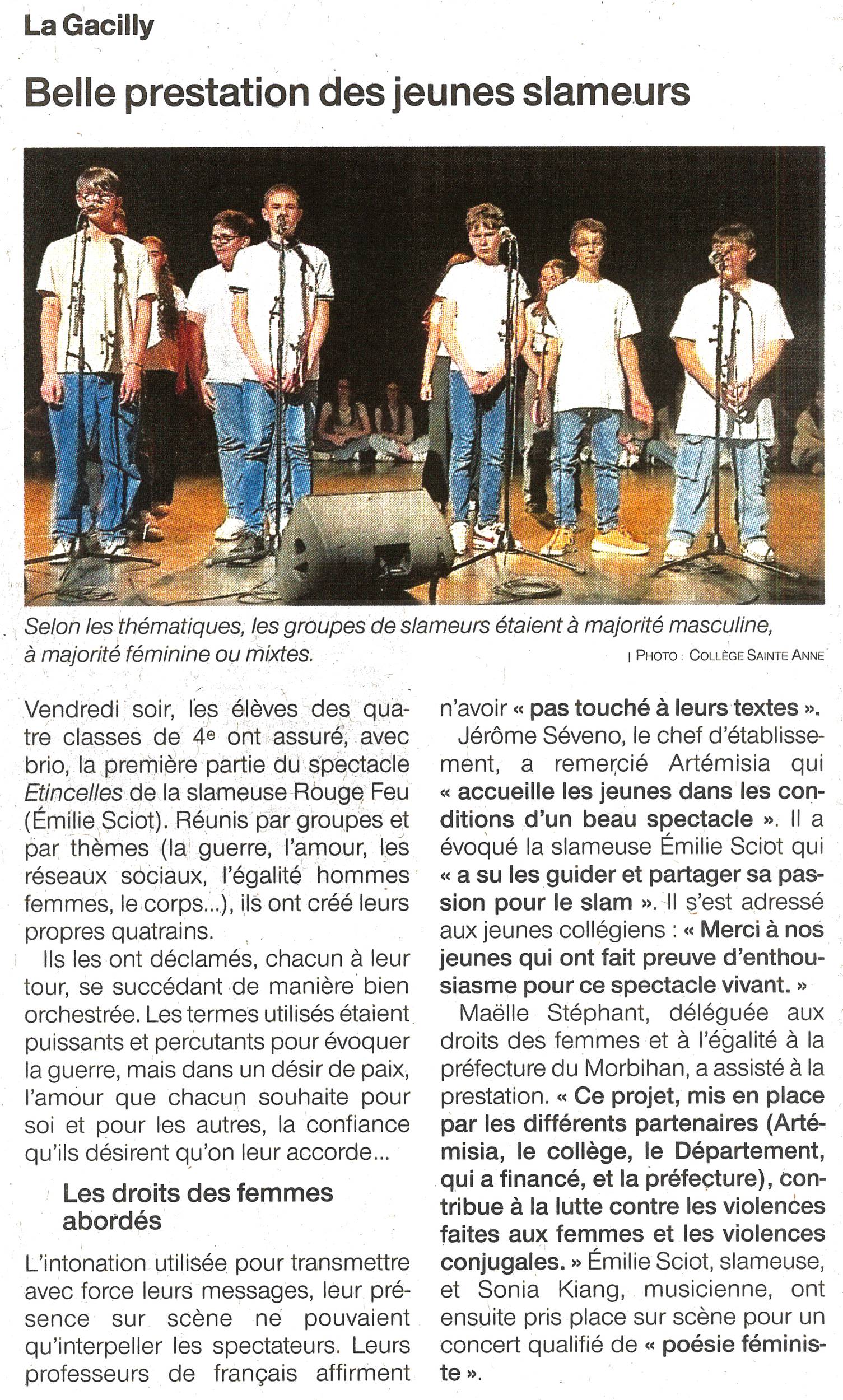 Près de 85 élèves des quatre classes de quatrième ont participé vendredi soir, dès 19H30 à un spectacle de slam à la salle Artémisia de la Gacilly.