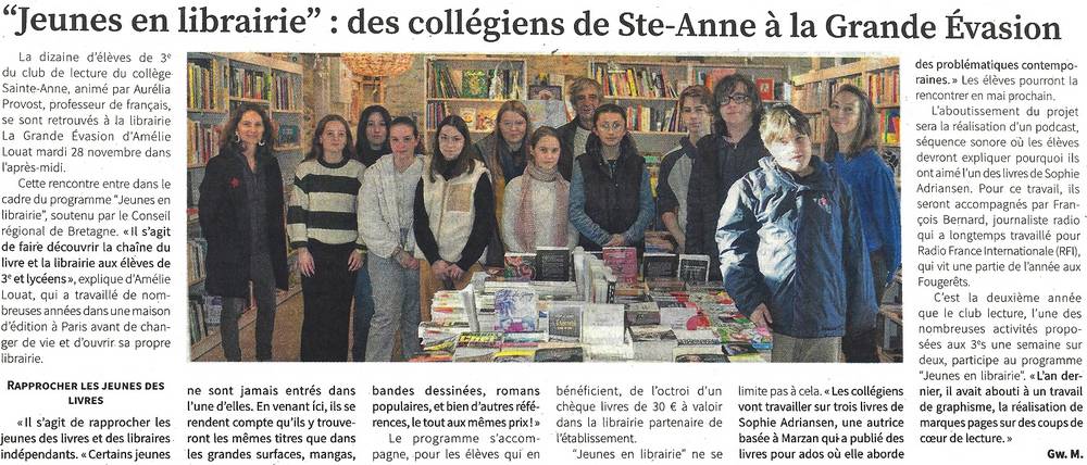 Dans le cadre de l’atelier lecture, dix élèves de troisième ont rencontré Amélie Louat, libraire à « La Grande Evasion » de La Gacilly.