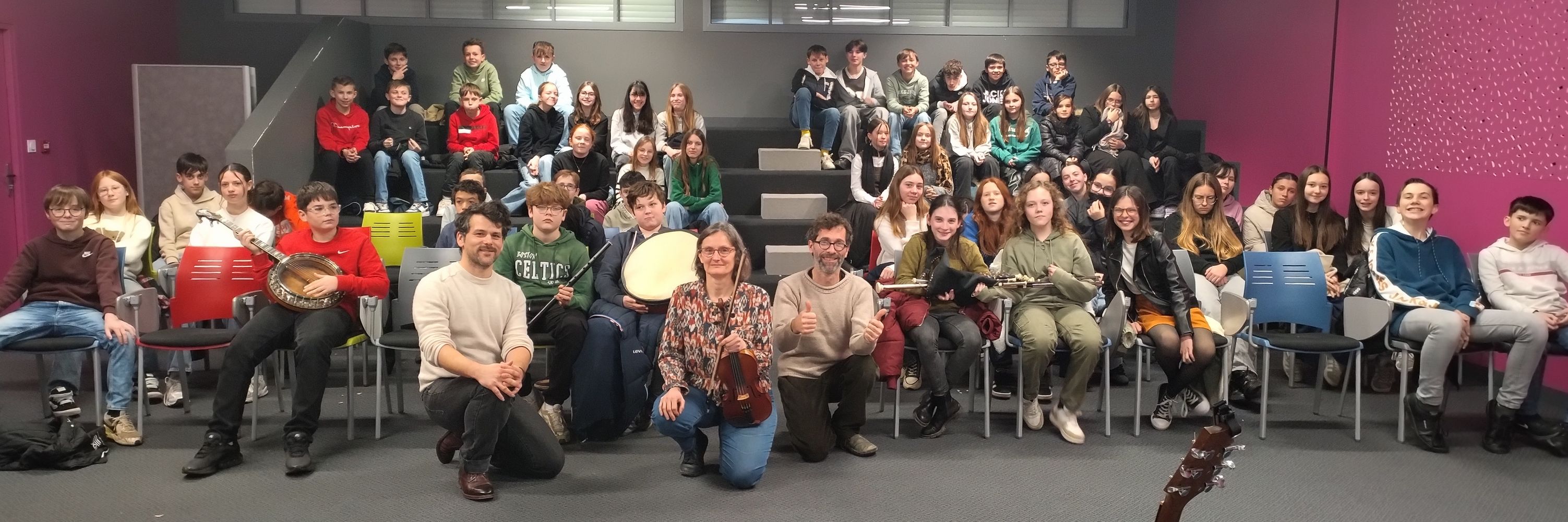 En ce jour de rentrée après les vacances de Noël, les élèves de 5ème ont eu l'occasion d'avoir une première approche de la musique irlandaise avec l'intervention de 3 musiciens (Pierre-Josquin Goisbault / Chantal Arnould et François Boudet) venus présenter des instruments représentatifs de ce genre musical (uillean pipe, fiddle, tin whistle, guitare, bodhràn...).